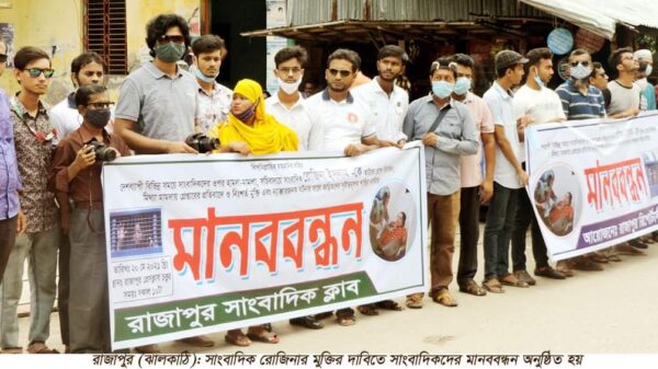 মো. নাঈম রাজাপুর (ঝালকাঠি) প্রতিনিধিঃ প্রথম আলোর জ্যেষ্ঠ প্রতিবেদক অনুসন্ধানী সাংবাদিক রোজিনা ইসলামকে স্বাস্থ্যমন্ত্রণালয়ে আটকে রেখে নির্যাতন, তাকে মিথ্যা মামলায়ে গ্রেফতারের প্রতিবাদে ও তারনিঃশর্ত মুক্তি এবং ন্যাক্কার জনক ঘটনারসাথে জড়িতদের দৃষ্টান্ত মূলক শাস্তির দাবিতে ঝালকাঠির রাজাপুরে মানববন্ধন করেছে স্থানীয় সংবাদকর্মীরা। বৃহস্পতিবার সকাল ১০টার দিকে প্রেসক্লাবের সামনে ঘণ্টাব্যাপি এ মানববন্ধন অনুষ্ঠিত হয়। এ মানব বন্ধনে উপজেলার ইলেকট্রনিক ও প্রিন্ট মিডিয়ারসকল সাংবাদিকগণ অংশ গ্রহন করেন।রাজাপুর প্রেসক্লাবের