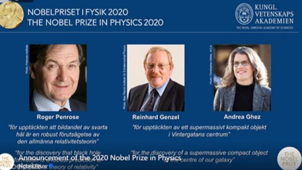 নোবেল জুরি বলেছে, ব্ল্যাক হোল বিষয়ে গবেষণার জন্য মঙ্গলবার ব্রিটেনের রজার পেনরোজ, জার্মানীর রেইনহার্ড গেনজেল এবং যুক্তরাষ্ট্রের আন্দ্রে গেজ পদার্থবিজ্ঞানে নোবেল পুরস্কার পেয়েছেন। খবর এএফপি’র।নোবেল কমিটি বলেছে, ‘মহাবিশ্বের এক অতি