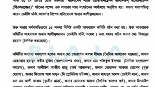 স্টাফ রিপোর্টার- আজ ৩১ মে ২০২৪ রোজ শুক্রবার “বাংলাদেশ ল্যান্ড এ্যাডমিনিষ্ট্রেশন জার্নালিষ্টস্ এসোসিয়েশন (বিএলএজেএ)” গঠনের লক্ষ্যে এক সাধারণ সভা সংগঠনের কার্যালয়ে অনুষ্ঠিত হয়। সভায় সভাপতিত্ব করেন ডেইলি মর্নিং ভয়েস’র বিশেষ