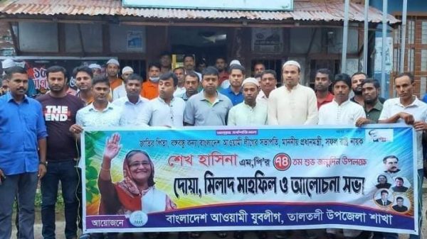 আওয়ামী লীগ সভাপতি ও প্রধানমন্ত্রী শেখ হাসিনার ৭৪তম জন্মদিন উপলক্ষে বরগুনার তালতলী উপজেলা যুবলীগ তার দীর্ঘায়ু কামনা করে দোয়া ও মিলাদ মাহফিল করেছে। শুক্রবার(২৫ সেপ্টেম্বর) উপজেলা আওয়ামী লীগ কার্যালয়ে কেন্দ্রীয়