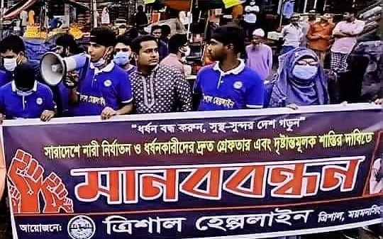 সারাদেশে নারী ও শিশু ধর্ষণের প্রতিবাদে (৭অক্টোবর) বুধবার সকালে মানববন্ধন করে ত্রিশাল হেল্পলাইন,হাত বাড়াও, অগ্রগামী স্বেচ্ছাসেবী সংগঠন।ময়মনসিংহের ত্রিশাল উপজেলার দরিরামপুর বাস-স্টেশনে ত্রিশাল হেল্পলাইনের সভাপতি হামিদুর রহমান সুমন, হাত বাড়াও এর