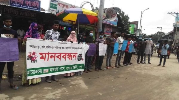 দেশে চলমান ধর্ষণ,নারীর প্রতি সহিংসতা ও জড়িতদের বিরুদ্ধে শাস্তির দাবিতে বুধবার সকাল ১১ টায় গংগাচড়া জিরো পয়েন্ট বাজারে মানববন্ধন করেছেন ফেসবুক ভিত্তিক সামাজিক সংগঠন আমরাই পাশে, গংগাচড়া। এতে উপস্থিত ছিলেন