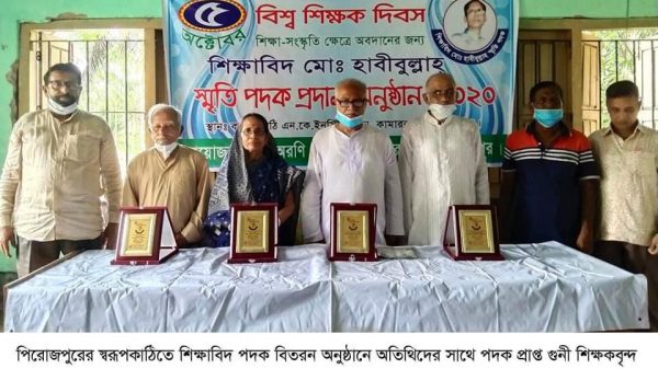 পিরোজপুরের নেছারাবাদে চার গুনী শিক্ষককে(অবসরপ্রাপ্ত) সংবর্ধনা ও শিক্ষাবিদ হাবিবুল্লাহ পদক দেওয়া হয়েছে। বিশ্ব শিক্ষক দিবস উপলক্ষে অরনি খেলাঘর আসরের পক্ষ থেকে ওই সংবর্ধনা দেওয়া হয়। গতকাল সোমবার সকালে জলাবাড়ী ইউনিয়ন