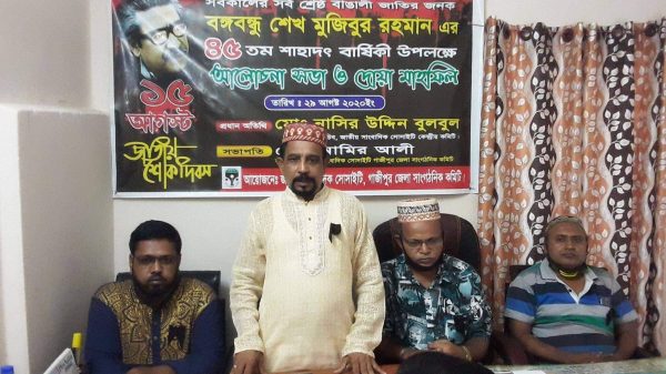 বাংলাদেশের স্বাধীকার আন্দোলনের মহান স্থপতি জাতির জনক বঙ্গবন্ধু শেখ মুজিবুর রহমানের ৪৫ তম শাহাদাত বার্ষিকী উপলক্ষে জাতীয় সাংবাদিক সোসাইটি গাজীপুর জেলা সাংগঠনিক কমিটির আলোচনা ও দোয়া মাহফিল অনুষ্ঠিত হয়েছে। শনিবার