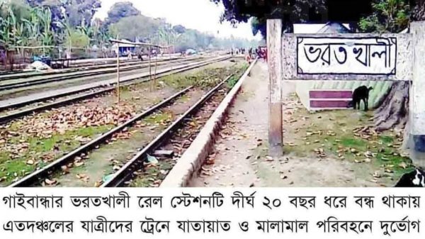 গাইবান্ধার ভরতখালী রেল স্টেশনটি দীর্ঘ ২০ বছর ধরে বন্ধ থাকায় এতদঞ্চলের যাত্রীদের ট্রেনে যাতায়াত ও মালামাল পরিবহনে দুর্ভোগ পোহাতে হচ্ছে।উলেখ্য,বৃটিশ আমল থেকে ভরতখালি রেলওয়ে স্টেশনটি ছিল এতদঞ্চলের একটি ব্যস্ততম রেলস্টেশন।