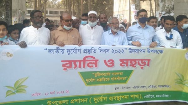 গৌরীপুর(ময়মনসিংহ) প্রতিনিধি : ‘মুজিববর্ষের সফলতা, দুর্যোগ প্রস্তুতির সফলতা’ এ শ্লোগানকে সামনে রেখে ময়মনসিংহের গৌরীপুর উপজেলা প্রশাসন ও দুর্যোগ ব্যবস্থাপনা বিভাগের উদ্যোগে বৃহস্পতিবার (১০ মার্চ) বিভিন্ন কর্মসূচীর মধ্য দিয়ে জাতীয় দুর্যোগ আরো দেখুন
