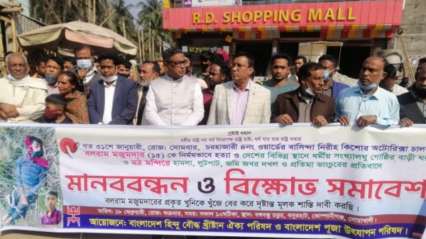 নোয়াখালী প্রতিনিধি: নোয়াখালীর কোম্পানীগঞ্জের চরহাজারী ইউনিয়নের অটোরিকশা চালক বলরাম মজুমদার (১৫) হত্যায় জড়িতদের গ্রেফতারের দাবি ও দেশব্যাপী সংখ্যালঘুদের বাড়ি-ঘর, মন্দির ও পূজামণ্ডপে হামলা লুটপাটের প্রতিবাদে মানববন্ধন এবং বিক্ষোভ সমাবেশ অনুষ্ঠিত আরো দেখুন