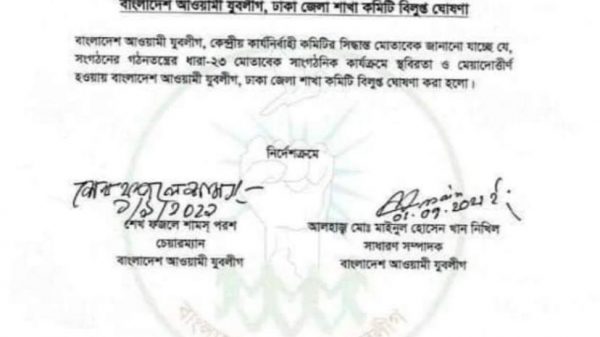 সোহেল রানা,সাভার(ঢাকা): বাংলাদেশ আওয়ামী যুবলীগের ঢাকা জেলা কমিটি বিলুপ্ত ঘোষণা করেছে কেন্দ্রীয় কমিটি। শুক্রবার(৩ সেপ্টেম্বর) বিকেলে কমিটির চেয়ারম্যান ও সাধারণ সম্পাদক স্বাক্ষরিত এক বিজ্ঞপ্তির মাধ্যমে এ তথ্য জানানো হয়। যুবলীগের আরো দেখুন
