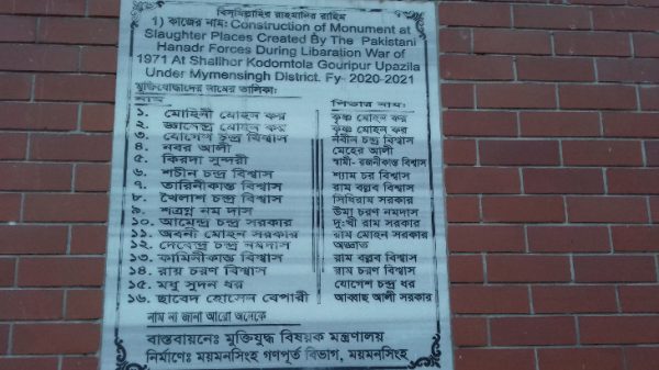 ওবায়দুর রহমান, উপজেলা প্রতিনিধি, গৌরীপুর, ময়মনসিংহ। ময়মনসিংহের গৌরীপুর উপজেলার শালিহর গ্রামে বধ্যভূমিতে নবনির্মিত স্মৃতিসৌধের নাম ফলকে গণশহীদদের নাম বীর মুক্তিযোদ্ধা হিসেবে লেখা হয়েছে। শনিবার (২১ আগস্ট) বধ্যভূমিতে গণশহীদদের প্রতি শ্রদ্ধা আরো দেখুন