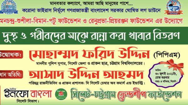 উৎফল বড়ুয়া, সিলেট: মানবতার কল্যাণে, আমরা আছি মানুষের পাশে করোনা ভাইরাস নির্মূলে গণপ্রজাতন্ত্রী বাংলাদেশ সরকার ঘোষিত লকডাউনে সিলেট নগরীর কয়েকটি এলাকার দুস্থ ও গরীবদের মাঝে রান্না করা খাবার বিতরণ আগামিকাল আরো দেখুন