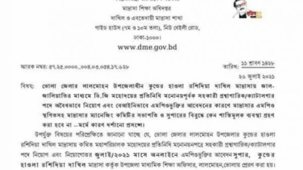 গাজী তাহের লিটন, জেলা প্রতিনিধি: উপকূলীয় জেলা ভোলার চরফ্যাশন ও লালমোহন উপজেলার সাতটি দাখিল মাদ্রাসায় প্রদত্ত নিয়মনীতি উপেক্ষা করে জালিয়াতির মাধ্যমে সহকারী গ্রন্থাগারিক/ক্যাটালগার নিয়োগ এবং এমপিওভুক্তির আবেদন করায় প্রতিষ্ঠানগুলোর এমপিও আরো দেখুন