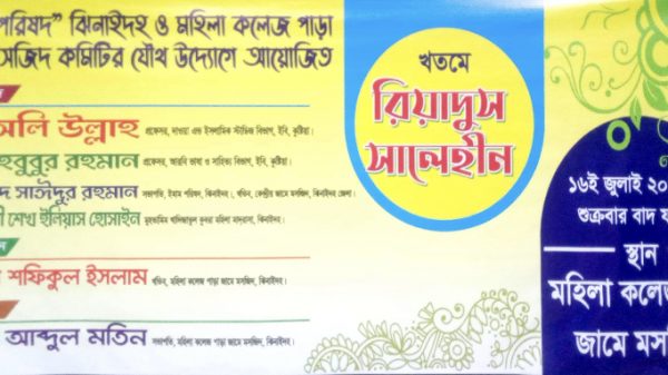 আব্বাস আলী। ঝিনাইদহ জেলা প্রতিনিধি: ঝিনাইদহ ইমাম পরিষদ ও মহিলা কলেজ পাড়া জামে মসজিদ কমিটি কতৃক যৌথ উদ্দোগে আয়োজিত খতমে রিয়াদুস সালেহীন অনুষ্টিত হয়েছে। আজ ভোর (ফজরের নামাজ) থেকে শুরু আরো দেখুন