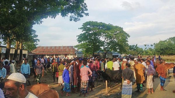 ওবায়দুর রহমান, উপজেলা প্রতিনিধি, গৌরীপুর, ময়মনসিংহ। ময়মনসিংহের গৌরীপুর উপজেলার মাওহাইউনিয়নের মাওহা উচ্চ বিদ্যালয় মাঠেমঙ্গলবার (১৩ জুলাই) স্বাস্থ্যবিধি না মেনেইবসানো হয়েছে অস্থায়ী কোরবানীর গরুরহাট। সরেজমিনে দেখা গেছে, এ হাটে তিল ধারনেরঠাঁই নেই। একজন অন্যজনের গা ঘেষেদাঁড়িয়ে আছে। কেউ পশুর দাম করছেন, কেউবা পশু কিনে নির্ধারিত যানবাহনেউঠাচ্ছেন। লোকের মুখে মাস্ক নেই। কারোকারো মাস্ক থাকলেও হয় পকেটে, না হয়তুথনিতে। সামাজিক দূরত্বের নির্দেশনাতোয়াক্কা না করে করোনার ঝুঁকি নিয়ে পশুকেনাবেচা চলছে। মঙ্গলবার সাপ্তাহিক বাজার থাকলেওকোনদিন এ হাটে দেখা যায়নি গরু কেনা-বেচা হয়নি। হঠাৎ কোরবানী এলে জমে উঠেগরুর হাট, তবে গরুর হাটে প্রচুর মানুষেরসমাগম ঘটেছে। ইজারাদারের পক্ষ থেকেওনেই কোন স্বাস্থ্যবিধির ব্যবস্থা, রাখা হয়নিহাত ধোয়ার জন্য পানি ও সাবানের যোগান। সম্প্রতি গৌরীপুরে আশংকাজনক হারেবাড়ছে করোনা ভাইরাসের সংক্রমণ। ছড়িয়েপড়েছে গ্রামে-গঞ্জে, এমন সময়ে গরুর হাটেশত শত মানুষের সমাগম ভাবিয়ে তুলেছেসচেতন মহলকে। হাটে গরু বিক্রি করতে আসা স্বপন মিয়াবলেন, ‘ বাড়ির কাছে বাজার জমায় গরুবাজারে নিয়ে আসছি। বিক্রি করতে না পারলে অন্য হাটে নিবো। বাজারে দেখে মনে হয় না দেশে করোনা আছে।’স্থানীয়রা জানান মাওহা বাজার সরকারী রাজস্ব তালিকাভুক্ত বাজার আরো দেখুন