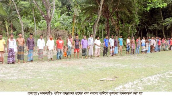 মো.নাঈম রাজাপুর (ঝালকাঠি) প্রতিনিধি: ঝালকাঠির রাজাপুরের মঠবাড়ি ইউনিয়নেরপশ্চিম বাদুরতলা গ্রামের ইউসুফ আলী ও সিদ্দিকের বাড়ি এলাকার ভারানি খালখননের দাবিতে দেড় শতাধিক কৃষকরা মানববন্ধন করেছেন। শুক্রবার বেলা ১১ টারদিকে ওই এলাকার কোলায় (মাঠ) এ মানববন্ধন কর্মসূচি অনুষ্ঠিত হয়। মানববন্ধনে বক্তব্য রাখেন কৃষক মালেকসিকদার, ইউসুফ আলী হাওলাদার, সোহরাফ হাওলাদার, বারেক সিকদার, সুলতান ফকির, মজিবর রহমান হাওলাদারও মজিবুর রহমান খান প্রমুখ। বক্তারা জানান, কয়েক বছর ধরে প্রায় ১ কিলোমিটারদীর্ঘ ওই খালটি পলী পড়ে মরে যাওয়ায়বর্তমানে পশ্চিম বাদুরতলা গ্রামের ২টি কোলায় (মাঠ) চরম পানি সংকট দেয়া দিয়েছে। এতে কৃষকরা সঠিক সময়ে বীজতলা করতে পারছেন না এবং অন্যান্যফসল ও সবজি চাষও ব্যাহত হচ্ছে। বর্তমানে পানি না ওঠায় বীজতলা করতে না পারায়ধান চাষ নিয়ে শঙ্কিত কৃষকরা। বক্তারা আরও জানান, মঠবাড়ি ইউনিয়ন পরিষদেরপেছনের খালটি থেকে ইউসুফ আলী ও সিদ্দিকের বাড়ির মধ্য দিয়ে দক্ষিনে প্রায় ১ কিলোমিটার এ খালটি কোলায় (মাঠ) আরো দেখুন
