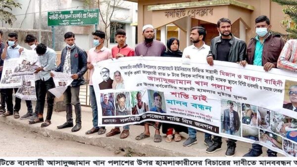 ঝালকাঠি প্রতিনিধি : ঝালকাঠির নলছিটিতে বিশিষ্ঠ ব্যবসায়ী ও সমাজসেবক আসাদুজ্জামান খান পলাশের উপর হামলাকারীদের দ্রুত গ্রেফতার ও বিচারের দাবীতে মানবন্ধন অনুষ্ঠিত হয়। রবিবার (০৭ ফেব্রুয়ারি) সকালে নলছিটি প্রেসক্লাব সম্মুখে ঘন্টব্যাপী আরো দেখুন