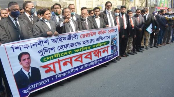 এম বশির, ব্যুরো প্রধান, বরিশালঃ বরিশালে শিক্ষানবীশ আইনজীবী রেজাউল করিম রেজাকে পুলিশ হেফাজতে হত্যার প্রতিবাদে দোষি পুলিশ অফিসারের বিচারের দাবীতে মানববন্ধন কর্মসূচি পালিত হয়েছে। আজ সোমবার (৪ই) জানুয়ারী সকাল সাড়ে আরো দেখুন