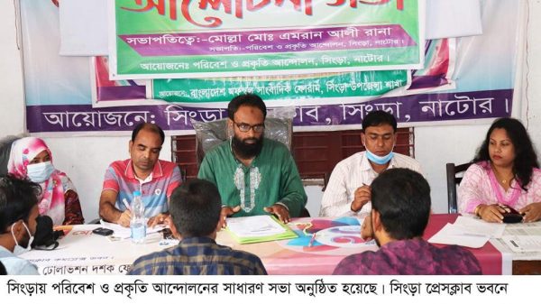 নাটোরের সিংড়ায় স্বেচ্ছাসেবামুলক সামাজিক সংগঠন পরিবেশ ও প্রকৃতি আন্দোলনের সাধারণ সভা অনুষ্ঠিত হয়েছে। শনিবার সকাল ১১টায় সিংড়া প্রেসক্লাব ভবন কমপ্লেক্সে এই সভা অনুষ্ঠিত হয়। সংগঠনের সভাপতি মোল্লা মোঃ এমরান আলী আরো দেখুন