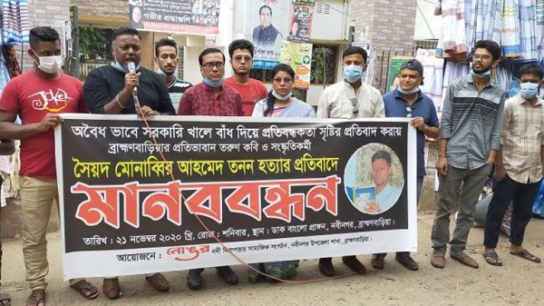 অবৈধভাবে সরকারি খালে বাঁধ দিয়ে প্রতিবন্ধকতা সৃষ্টির প্রতিবাদ করায় ব্রাহ্মণবাড়িয়ার প্রতিভাবান তরুণ কবি ও সংস্কৃতিককর্মী সৈয়দ মোনাব্বির আহামেদ তনন হত্যার প্রতিবাদে নদী নিরাপত্তার সামাজিক সংগঠন ‘নোঙর ব্রাহ্মণবাড়িয়ার নবীনগর উপজেলা শাখার আরো দেখুন