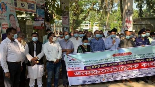 ফরিদপুরের বোয়ালমারীতে করোনা ভাইরাসের (কোভিড-১৯) সংক্রমণ প্রতিরোধে জনসচেতনতামূলক কার্যক্রমের অংশ হিসেবে শনিবার (৭ নভেম্বর) বেলা ১০ টা থেকে মানব বন্ধন অনুষ্ঠিত হয়েছে। বোয়ালমারী উপজেলা প্রশাসনের আয়োজনে এবং বাংলাদেশ স্কাউটসের সহযোগিতায় আরো দেখুন