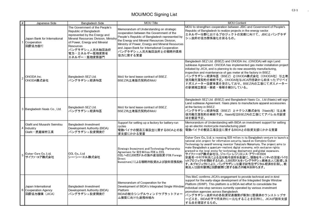 মোট ৪১৮ মিলিয়ন ডলার জাপান বাংলাদেশের অর্থনৈতিক সংস্কার এবং জলবায়ু স্থিতিস্থাপকতার জন্য উন্নয়ন নীতি ঋণ হিসেবে দেবে। টোকিও জয়দেবপুর-ঈশ্বরদীকে ডুয়েল-গেজ ডাবল রেলপথে উন্নীত করার জন্য ৬৪১ মিলিয়ন ডলার এবং বৃত্তির জন্য অনুদান হিসেবে আরও ৪.২ মিলিয়ন ডলার ঋণ দেবে।