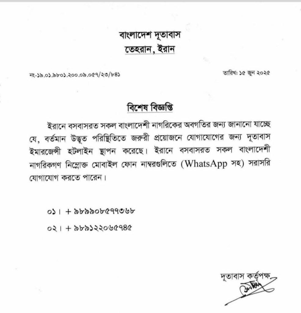 বিজ্ঞপ্তিতে বলা হয়, ইরানে বসবাসরত বাংলাদেশি নাগরিকের অবগতির জন্য জানানো যাচ্ছে যে, বর্তমান উদ্ভূত পরিস্থিতিতে জরুরি প্রয়োজনে যোগাযোগের জন্য দূতাবাস ইমার্জেন্সি হটলাইন স্থাপন করেছে।