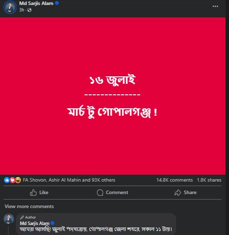এছাড়া উক্ত পোস্টের কমেন্টে তিনি লিখেছেন, ‘আমরা আসছি! জুলাই পদযাত্রায়, গোপালগঞ্জ জেলা শহরে, সকাল ১১টায়।’