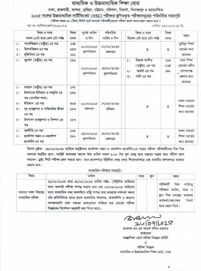 বুধবার (২৩ জুলাই) বিকেলে আন্তঃশিক্ষা বোর্ড পরীক্ষা নিয়ন্ত্রক কমিটির আহ্বায়ক ও ঢাকা বোর্ডের পরীক্ষা নিয়ন্ত্রক অধ্যাপক এস এম কামাল উদ্দিন হায়দারের সই করা বিজ্ঞপ্তিতে এ তথ্য জানানো হয়।এতে ৯টি শিক্ষা বোর্ডের মোট চারদিনের স্থগিত পরীক্ষার নতুন সময়সূচি প্রকাশিত হয়।