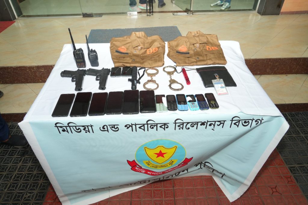 এসময় নিস্তারিতদের নিকট হতে একটি মাইক্রোবাস, দুইটি ডিবি জ্যাকেট, দুইটি ওয়াকিটকি, একটি ভুয়া পুলিশ আইডি কার্ড, দুইটি হ্যান্ডকাফ, দুইটি খেলনা পিস্তল, দুইটি পকেট রাউটার, ছয়টি এন্ড্রয়েড মোবাইল ফোন, ছয়টি বাটন মোবাইল, এক্সপেন্ডেবল লাঠি ও লেজার লাইট উদ্ধার করা হয়।