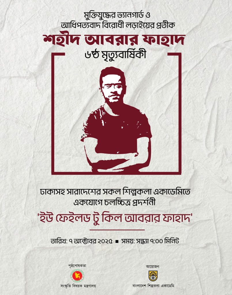 উক্ত পোস্টে জানানো হয়, শহীদ আবরার ফাহাদের ৬ষ্ঠ মৃত্যুবার্ষিকীতে আগামীকাল ৭ অক্টোবর সন্ধ্যা ৭টায় ঢাকাসহ দেশের সকল শিল্পকলা একাডেমিতে ‘ইউ ফেইলড টু কিল আবরার ফাহাদ’ প্রামাণ্যচিত্র প্রদর্শিত হবে। ঢাকার প্রদর্শনীতে উপস্থিত থাকবেন আবরার ফাহাদের বাবা।