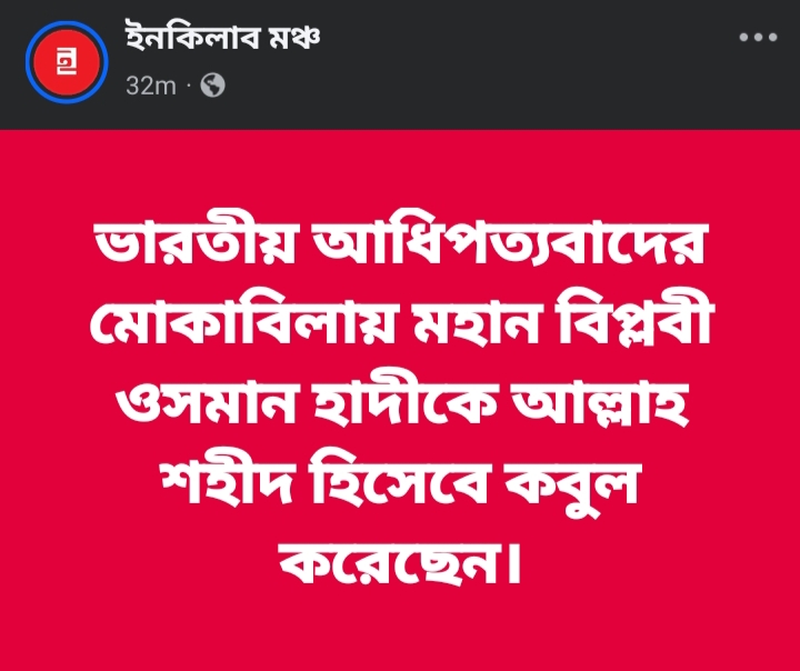 উক্ত পোস্টে বলা হয়, ‘ভারতীয় আধিপত্যবাদের মোকাবিলায় মহান বিপ্লবী ওসমান হাদিকে আল্লাহ শহীদ হিসেবে কবুল করেছেন।’