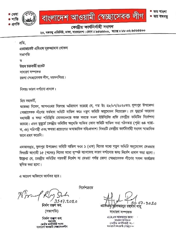 নোটিশে আরো বলা হয়, করোনা ও বন্যা মোকাবিলায় পরিস্থিতিতে দলের অনুমতি ছাড়া নতুন কমিটি গঠন, গঠনতন্ত্রের ৩৪ ধারার ঝ,ঞ এর পরিপন্থী এবং ক্ষমতা প্রকাশের অস্বাভাবিক বহি:প্রকাশ।