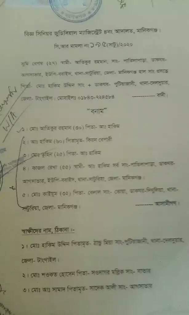 সুমি বেগম(২৭)সাটুরিয়া থানায় মামলা নিরোধ আইনে মামলা দায়ের করে মামলা নং-সি আর মামলা-১৯৫/২০