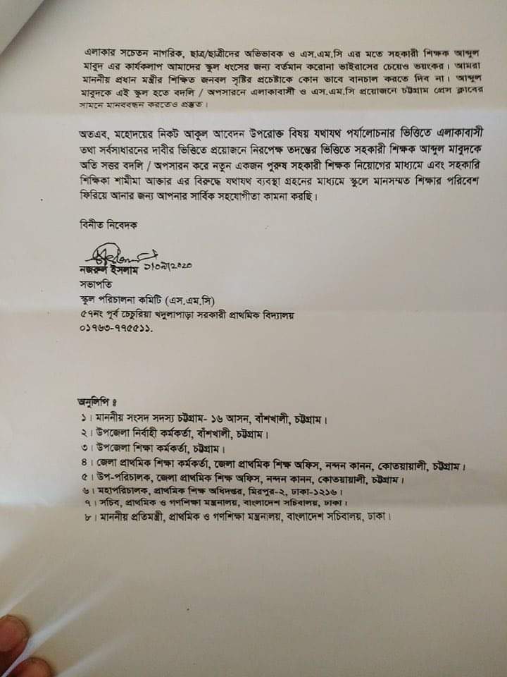 অভিযোগের অনুলিপি হিসেবে সংসদ সদস্য চট্টগ্রাম-১৬, জেলা প্রাথমিক শিক্ষা কর্মকর্তা, জেলা প্রাথমিক শিক্ষা অফিস, শিক্ষা বিভাগের উপ-পরিচালক,মহাপরিচালক, সচিব, প্রাথমিক ও গণশিক্ষা প্রতিমন্ত্রী বরাবরে প্রেরন করা হয়েছে।