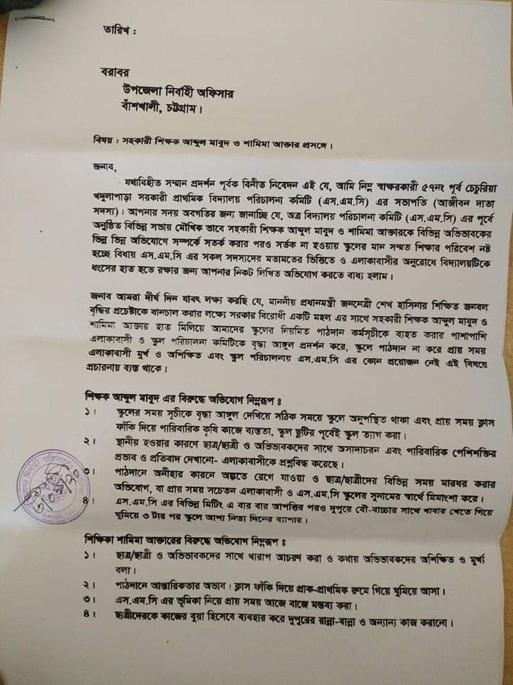 অভিযোগে আরো উল্লেখ করা হয়, মাননীয় প্রধানমন্ত্রী জননেত্রী শেখ হাসিনার শিক্ষিত জনবল বৃদ্ধির প্রচেষ্টাকে বানচাল করার লক্ষ্যে সরকার বিরোধী একটি মহলের সাথে সহকারী শিক্ষক আব্দুল মাবুদ ও শামিমা আক্তার হাত মিলিয়ে স্কুলের নিয়মিত পাঠদান কর্মসূচীকে ব্যহত করার পাশাপাশি পারিবারিক প্রভাব খাটিয়ে এলাকাবাসী ও স্কুল পরিচালনা কমিটিকে বৃদ্ধা আঙ্গুল প্রদর্শন করে বিভিন্ন কু্টক্তি পূর্ণ মন্তব্য করে। কর্তৃপক্ষের অনুমতি না নিয়ে বিদ্যালয়ে সঠিক সময়ে অনুপস্থিত না থাকা এবং ক্লাস ফাঁকি দিয়ে কৃষিও পারিবারিক কাজে ব্যস্ততা ও স্কুল ছুটির পূর্বেই বিদ্যালয় ত্যাগ করা সহ নানান অনিয়মের অভিযোগ উত্তাপন করেন।