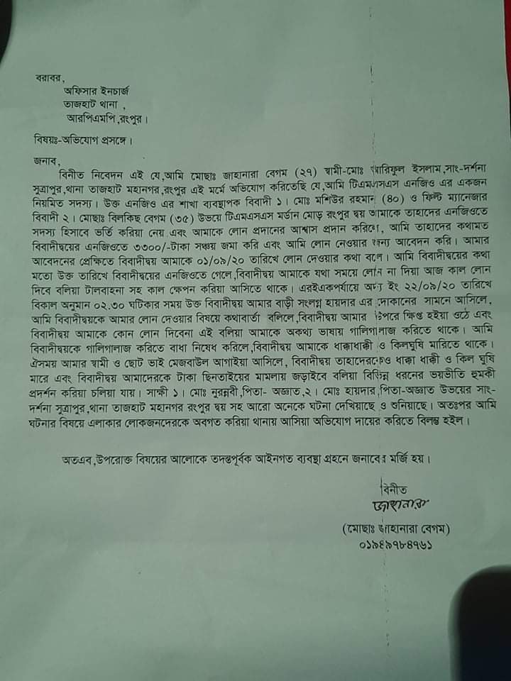 জাহানারা বেগম বলেন, আমাকে তাদের এনজিওতে সদস্য হিসাবে ভর্তি করিয়ে নেয় এবং আমাকে লোন দেওয়ার কথা বলে ভর্তি করে নেয়।আমি ৩,৩০০/- টাকা সঞ্চয় জমা করি এবং আমি লোন নেওয়ার জন্য আবেদন করি।আমাকে যথা সময়ে লোন না দিয়ে টালবাহনা করে। মঙ্গলবার ২২/০৯/২০ইং তারিখে দুপুর ২.৩০ মিনিটে আমার বাড়ি সংলগ্ন হায়দারের দোকানের সামনে দেখা পেয়ে আমার লোন দেওয়ার বিষয়ে কথা বললে ম্যানেজার সফিউল ও বিলকিস বেগম আমার উপর ক্ষিপ্ত হয়ে উঠে আমাকে লোন দিবে না বলে অকথ্য ভাষায় গালিগালাজ করে।