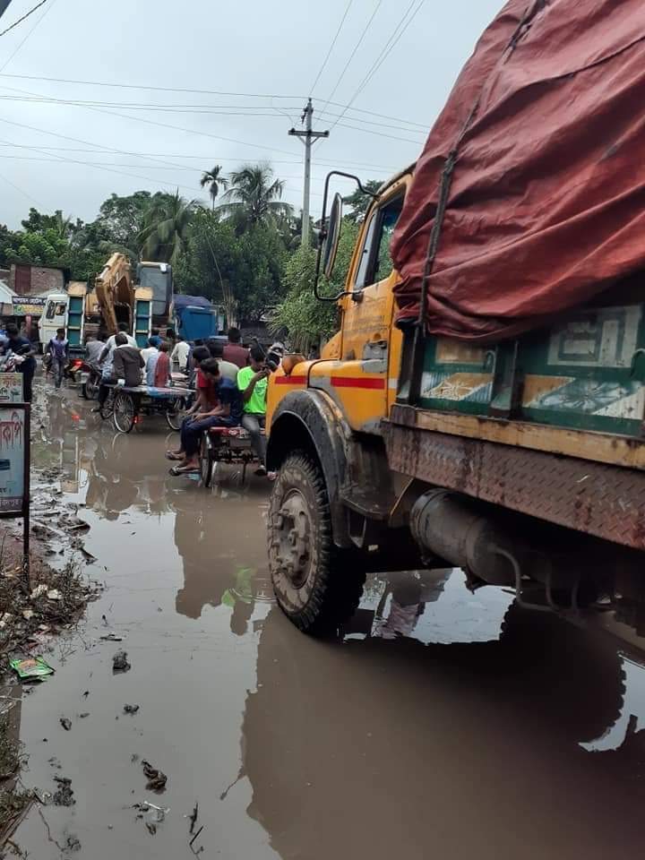 সড়কের দুই পাশে পানি, কাঁদায় বেহাল দশা।