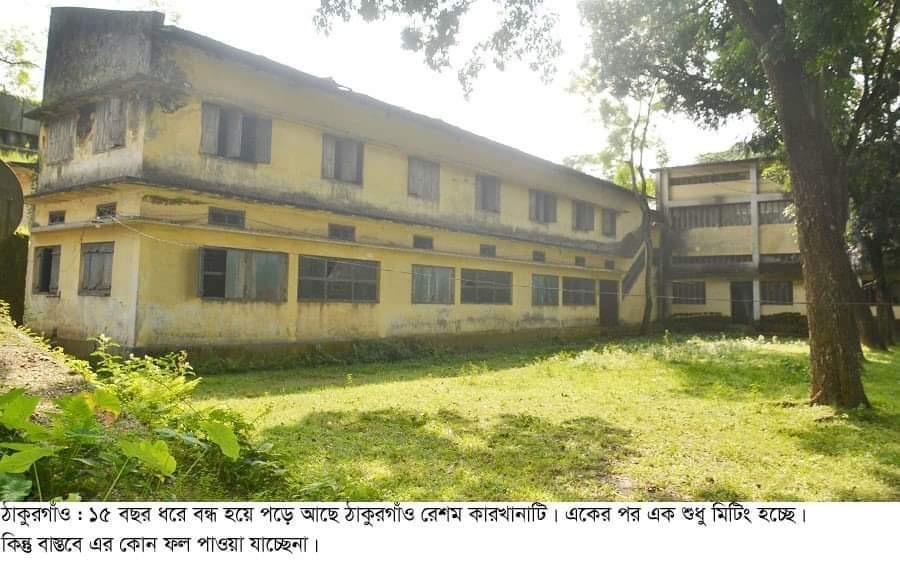 ঠাকুরগাঁও রেশম কারখানায় গিয়ে দেখা যায়, দীর্ঘদিন ধরে অব্যবহৃত ও সংস্কারের অভাবে কারখানায় দেয়ালসহ বিভিন্ন দরজা-জানালা ভেঙে গেছে। মেশিনসহ প্রয়োজনীয় জিনিসগুলো রয়েছে অকেজো অবস্থায়।