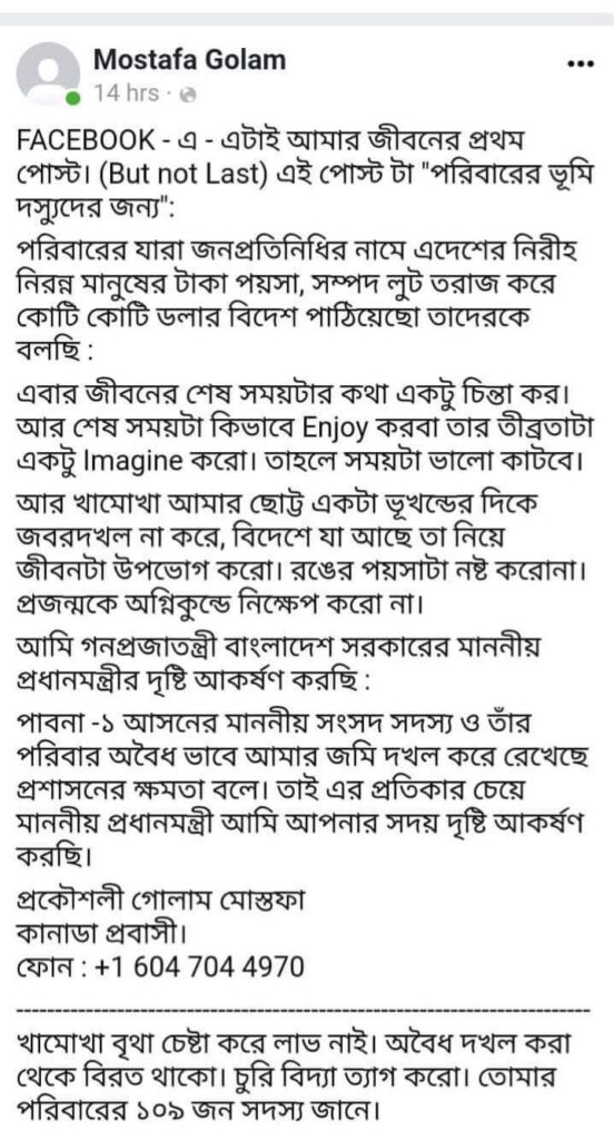 পাবনা এক আসনের সাংসদ সাবেক স্বরাষ্ট প্রতিমন্ত্রী এ্যাডঃ শামসুল হক টুকু ও তার সন্তান ঢাকা বিশ্ববিদ্যালয়ের শিক্ষক নাসিফ শামস রনি’র বিরুদ্ধে জমি দখলের অভিযোগ করেছে কানাডা প্রবাসী প্রকৌশলী গোলাম মোস্তফা।তিনি গতকাল তার ফেসবুক পোষ্টের মাধ্যমে মাননীয় প্রধানমন্ত্রীর কাছে প্রতিকার চেয়েছেন।