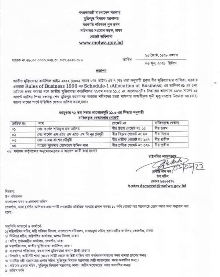 প্রজ্ঞাপনে বলা হয়, জাতীয় মুক্তিযোদ্ধা কাউন্সিলের ৭২তম সভার ১১.৩ নং আলোচ্যসূচির সিদ্ধান্তের আলোকে ১৯৭৫ সালের ১৫ আগস্ট জাতির পিতা বঙ্গবন্ধু শেখ মুজিবুর রহমানসহ অন্যান্য শহীদদের হত্যা মামলায় আত্মস্বীকৃত খুনি মৃত্যুদণ্ডপ্রাপ্ত চারজনের খেতাব বাতিল করা হলো।
