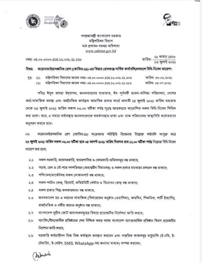 তবে ২৩ জুলাই সকাল ৬টা থেকে ৫ আগস্ট (বৃহস্পতিবার) দিবাগত রাত ১২টা পর্যন্ত নতুন করে বিধিনিষেধ আরোপ করে প্রজ্ঞাপন জারি করেছে মন্ত্রিপরিষদ বিভাগ।