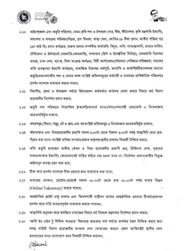 ১০. আইনশৃঙ্খলা এবং জরুরি পরিষেবা, যেমন-কৃষি পণ্য ও উপকরণ (সার, বীজ, কীটনাশক, কৃষি যন্ত্রপাতি ইত্যাদি), খাদ্যশস্য ও খাদ্যদ্রব্য পরিবহন/বিক্রয়, ত্রাপ বিতরণ, স্বাস্থ্য সেবা, কোভিড-১৯ টিকা প্রদান, জাতীয় পরিচয়পত্র (এনআইডি) প্রদান কার্যক্রম, রাজস্ব আদায় সম্পর্কিত কার্যাবলী, বিদ্যুৎ, পানি, গ্যাস/জ্বালানি, ফায়ার সার্ভিস, টেলিফোন ও ইন্টারনেট (সরকারি-বেসরকারি), গণমাধ্যম (প্রিন্ট ও ইলেকট্রনিক মিডিয়া), বেসরকারি নিরাপত্তা ব্যবস্থা, ডাক সেবা, ব্যাংক, ভিসা সংক্রান্ত কার্যক্রম, সিটি করপোরেশন/পৌরসভা (পরিষ্কার-পরিচ্ছন্নতা, সড়কের বাতি ব্যবস্থাপনা ইত্যাদি কার্যক্রম), সামাজিক নিরাপত্তা কর্মসূচি, ফার্মেসি ও ফার্সাসিউটিক্যালসসহ অন্যান্য জরুরি/অত্যাবশ্যকীয় পণ্য ও সেবার সঙ্গে সংশ্লিষ্ট অফিসসমূহের কর্মচারী ও যানবাহন প্রাতিষ্ঠানিক পরিচয়পত্র প্রদর্শন সাপেক্ষে যাতায়াত করতে পারবে।