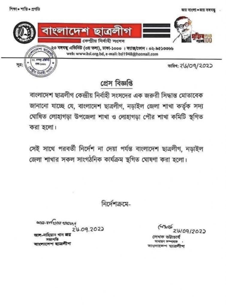 বিজ্ঞপ্তিতে বলা হয়,বাংলাদেশ ছাত্রলীগ কেন্দ্রীয় নির্বাহী সংসদের এক জরুরী সিদ্ধান্ত মোতাবেক জানানো যাচ্ছে যে,বাংলাদেশ ছাত্রলীগ নড়াইল জেলা শাখা কর্তৃক সদ্য ঘোষিত লোহাগড়া উপজেলা শাখা ও পৌর শাখা ছাত্রলীগের কমিটি স্থগিত করা হলো। সেই সাথে পরবর্তী নির্দেশ না দেয়া পর্যন্ত বাংলাদেশ ছাত্রলীগ,নড়াইল জেলা ছাত্রলীগের সকল সাংগঠনিক কার্যক্রম স্থগিত ঘোষণা করা হলো।