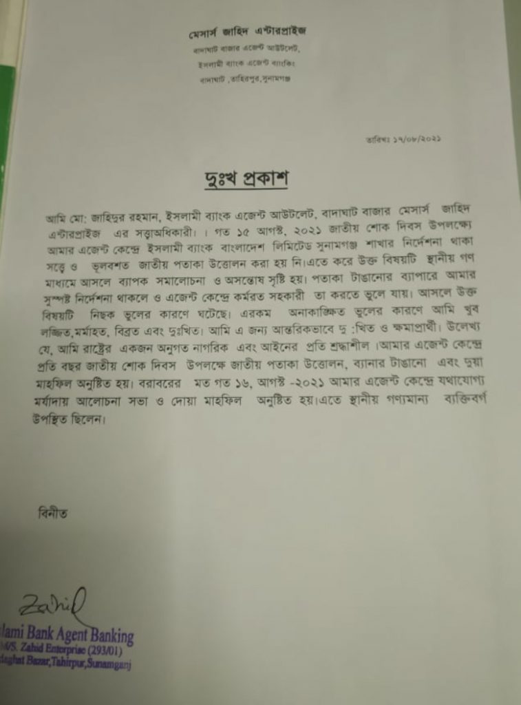 আমি মোঃ জাহিদুর রহমান, ইসলামী ব্যাংক এজেন্ট আউটলেট, বাদাঘাট বাজার মেসার্স জাহিদ এন্টারপ্রাইজের সত্বাধীকারী। গত ১৫ই আগষ্ট ২০২১ইং তারিখে জাতীয় শোক দিবস উপলক্ষ্যে আমার এজেন্ট কেন্দ্রে ইসলামী ব্যাংক বাংলাদেশ লিমিটেড, সুনামগঞ্জ শাখার নির্দেশনা থাকা সত্বেও ভুলবশত জাতীয় পতাকা উত্তোলন করা হয়নি। এতে করে উক্ত বিষয়টি নিয়ে স্থানীয় সামাজিক যোগাযোগ মাধ্যম (ফেইসবুকসহ) গনমাধ্যমে ব্যাপক সমালোচনা ও অসন্তোষ সৃষ্টি হয়।