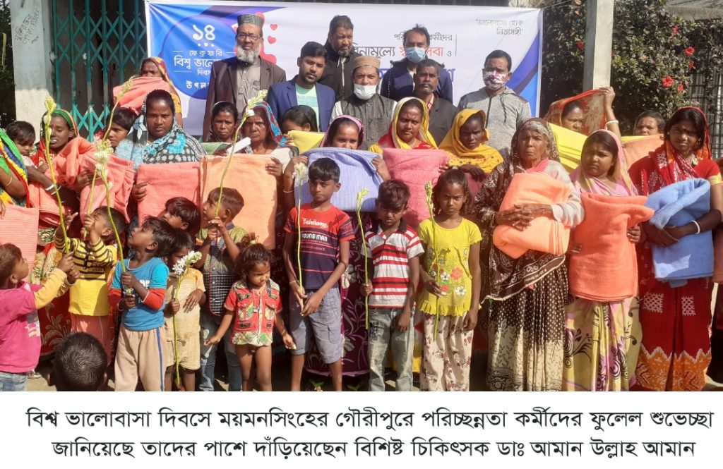 বিশ্ব ভালোবাসা দিবসে ময়মনসিংহের গৌরীপুরে পরিচ্ছন্নতা কর্মীদের ফুলেল শুভেচ্ছা জানিয়েছে তাদের পাশে দাঁড়িয়েছেন বিশিষ্ট চিকিৎসক ডাঃ আমান উল্লাহ আমান। তিনি ময়মনসিংহ জেলার মুস্তাকিম (প্রাঃ) হসপিটালের ব্যবস্থাপনা পরিচালক।