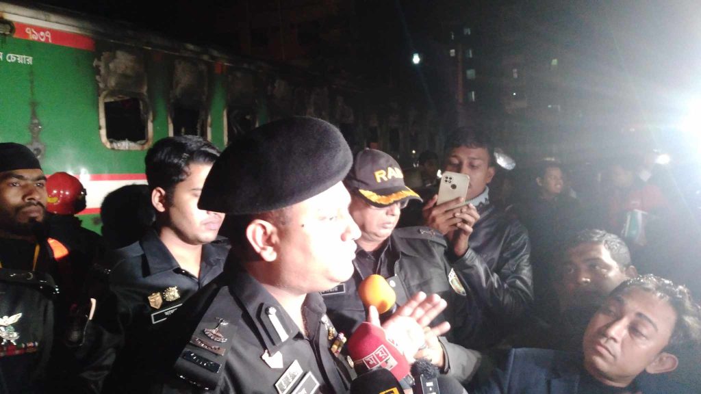 ফায়ার সার্ভিসের ডিউটি অফিসার রাকিবুল হাসান গণমাধ্যমকে বলেন, ট্রেনটি চলন্ত অবস্থায় ছিল। ট্রেনের চারটি বগি পুড়ে গেছে। আগুন নিয়ন্ত্রণে কাজ করছে সাতটি ইউনিট।
