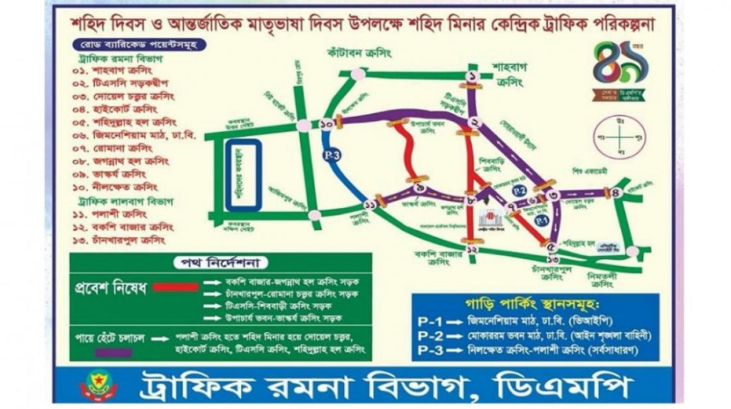 আন্তর্জাতিক মাতৃভাষা দিবস ও শহীদ দিবস উদযাপন উপলক্ষে কেন্দ্রীয় শহীদ মিনার ও এর আশপাশে প্রবেশের অন্তত ১৩টি ক্রসিং বন্ধ থাকবে। ফলে যান চলাচল বন্ধ থাকবে এসব সড়কে।