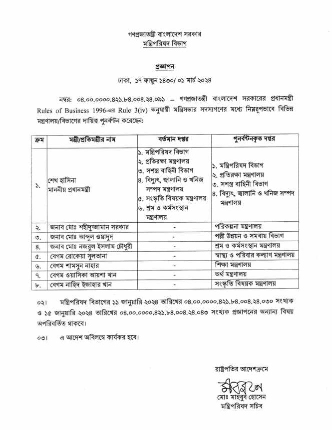 উল্লেখ্য, দ্বাদশ জাতীয় সংসদ নির্বাচনের পর গত ১১ জানুয়ারি শপথ নেন আওয়ামী লীগ সভানেত্রী শেখ হাসিনার নেতৃত্বে ৩৭ সদস্যের নতুন মন্ত্রিসভা। বর্তমান মন্ত্রিসভায় প্রধানমন্ত্রী বাদে পূর্ণমন্ত্রী রয়েছেন ২৫ জন এবং প্রতিমন্ত্রী ১১ জন।