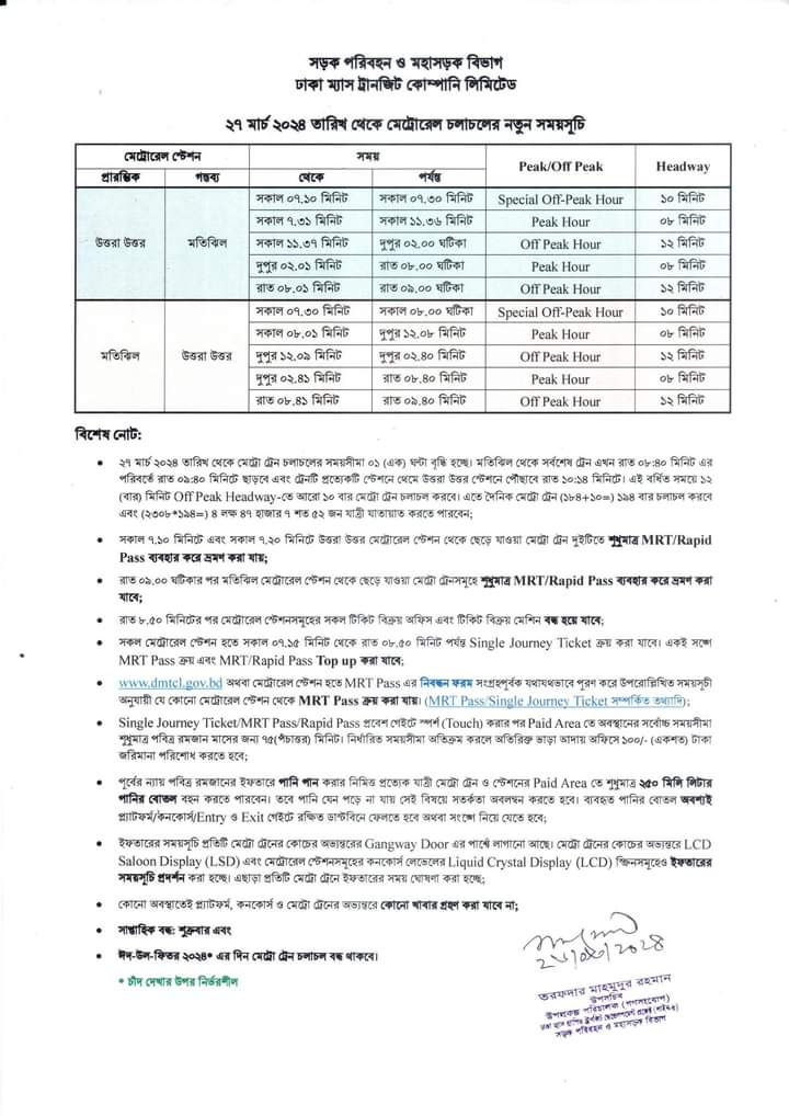 এমএএন ছিদ্দিক বলেন, ‘আগামীকাল বুধবার থেকে উত্তরা উত্তর স্টেশন থেকে সর্বশেষ ট্রেন ছাড়বে রাত ৯টায়। আর মতিঝিল স্টেশন থেকে সর্বশেষ ট্রেন ছাড়বে রাত ৯টা ৪০ মিনিটে। আগামীকাল থেকে পবিত্র ঈদুল ফিতরের আগের দিন পর্যন্ত মেট্রোরেল চলাচলের সময়সীমা এক ঘণ্টা বাড়বে। বাড়তি সময়ে আরও ১০টি ট্রেন চলাচল করবে। এতে দিনে মেট্রো চলাচলের মোট সংখ্যা হবে ১৯৪ বার। সেই সময় যাত্রী চলাচল করতে পারবেন দিনে ৪ লাখ ৪৭ হাজার ৭৫২ জন।’