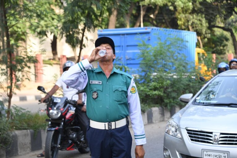 বৈশাখের খরতাপে কয়েকদিন ধরেই হাঁসফাঁস করছে মানুষ। প্রচণ্ড দাবদাহে জনজীবন হয়ে উঠেছে দুর্বিষহ। এই তীব্র গরমের মাঝেও খোলা আকাশের নিচে ঢাকা মেট্রোপিলিটন পুলিশের ট্রাফিক বিভাগের পুলিশ সদস্যরা যানজট নিরসনে ও মানুষের যাতায়াত নির্বিঘ্ন করতে নিরলসভাবে তাদের দায়িত্ব পালন করছেন। রাস্তায় দীর্ঘক্ষণ রোদে দাঁড়িয়ে থাকা ট্রাফিক সদস্যগণ হিটস্ট্রোকসহ পানি শূন্যতা, মাথাব্যথা ও শারীরিক দুর্বলতায় ভুগে থাকে।
