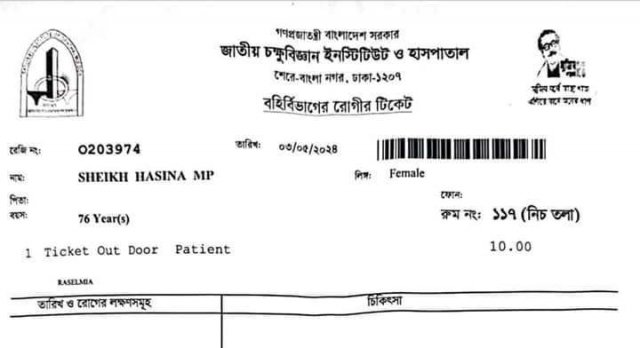 রাজধানীর শেরে বাংলা নগরে জাতীয় চক্ষু বিজ্ঞান ইনস্টিটিউট ও হাসপাতালে সাধারণ রোগীর মতো ১০ টাকার টিকিট কেটে চোখ পরীক্ষা করালেন প্রধানমন্ত্রী শেখ হাসিনা।